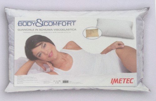 Description : Guanciale della linea Body&Comfort Imetec, con fodera in 100% cotone ed imbottitura in schiuma viscoleastica.E' un guanciale innovativo, anatomico perchè grazie alla sua composizione a lenta memoria si modella delicatamente alla forma del capo e delle spalle, confortevole perchè permette una posizione fisiologicamente naturale grazie al suo sostegno delicato e traspirante, grazie ai fori presenti sulla sagoma.